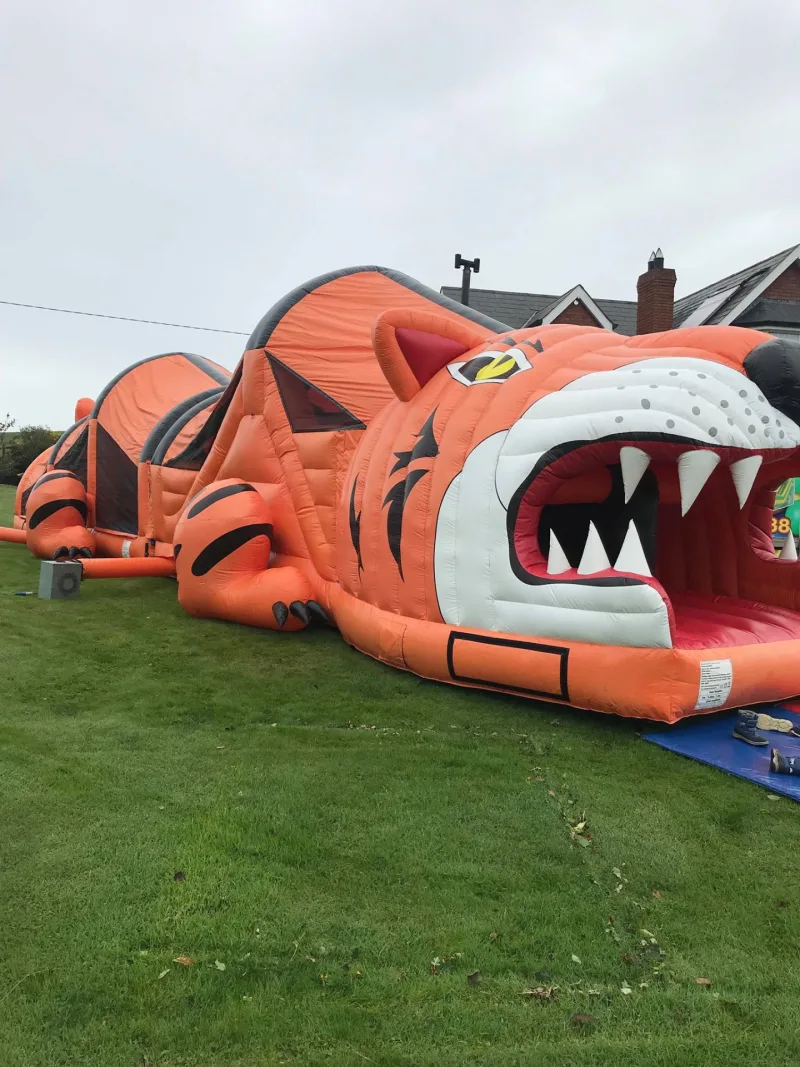 When going in the back run through bollards, climb the mini slide , dodge the Biff N Bash and go under the bars, climb the giant wall and slide down the 9ft slide out through the Tigers mouth, but do be careful of those Giant Teeth.