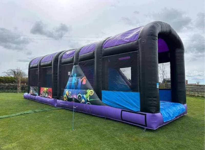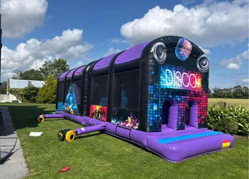 42 ft Disco obstacle course, this obstacle course is very fun and vibrant on the outside and the fun element carries on throughout. it boasts bish n bash , over and under and a massive climbing wall up to the top of its steep and slippery slide .